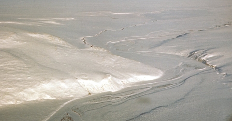 Aerial view of snow covering rolling tundra and a river on Alaska's coastal plain.