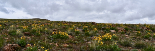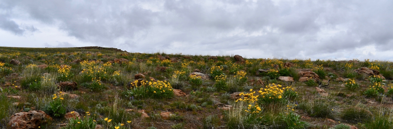 Arrowleaf balsamroot grows on a hillside in Nevada. Arrowleaf balsamroot is native to the Great Basin and great for pollinators. It can be found in many different places.
