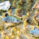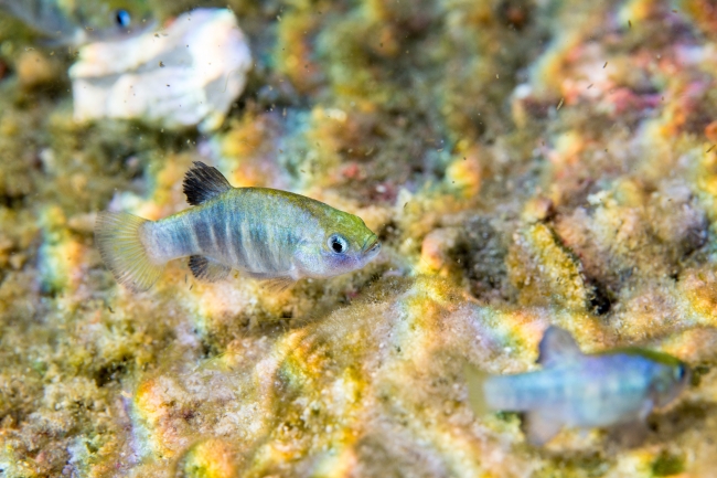 Small chunky fish, usually with several indistinct vertical stripes. Females and young fish are olive green to tan in coloration. Males have a bluish tint, which is more vibrant during spawning. This Ash Meadows Amargosa pupfish occurs in warm spring-fed streams and spring pools. This species feeds on algae, diatoms and smaller invertebrates that grow on the substrate. They spawn year-round, but primarily during the spring and early summer by laying individual eggs on the substrate. The Ash Meadows Amargosa pupfish historically occurred within 10 spring systems throughout the Ash Meadows area of the Amargosa Valley , Nye County , Nevada . It currently occurs on the Ash Meadows National Wildlife Refuge and most of the major spring systems within this Refuge are designated Critical Habitat.