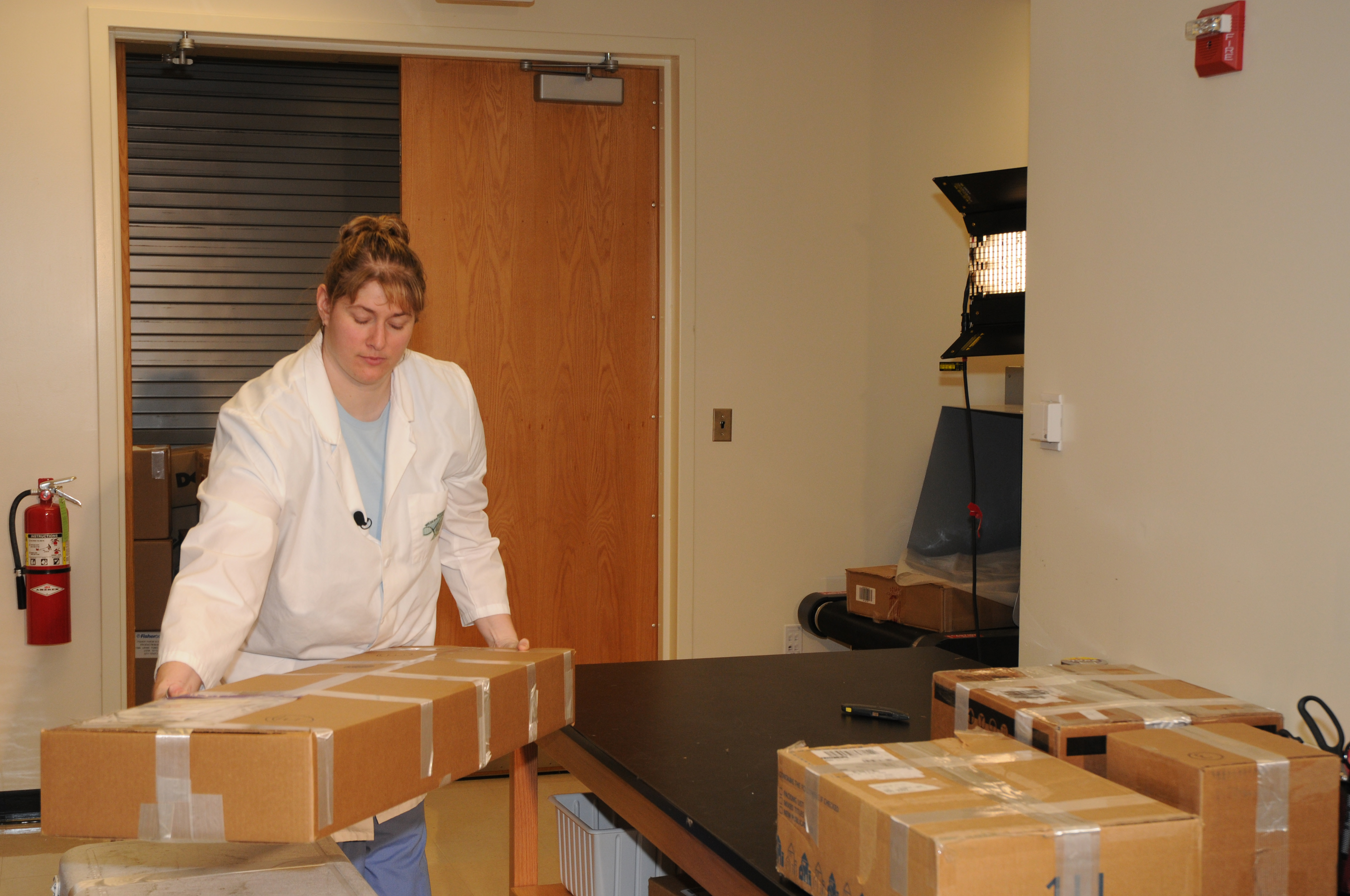 Laura Daugherty, Forensic Lab Technician, in receiving area processing boxes with evidence.