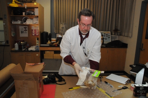 Barry Baker, Acting Supervisor, opening box with cat skull inside.