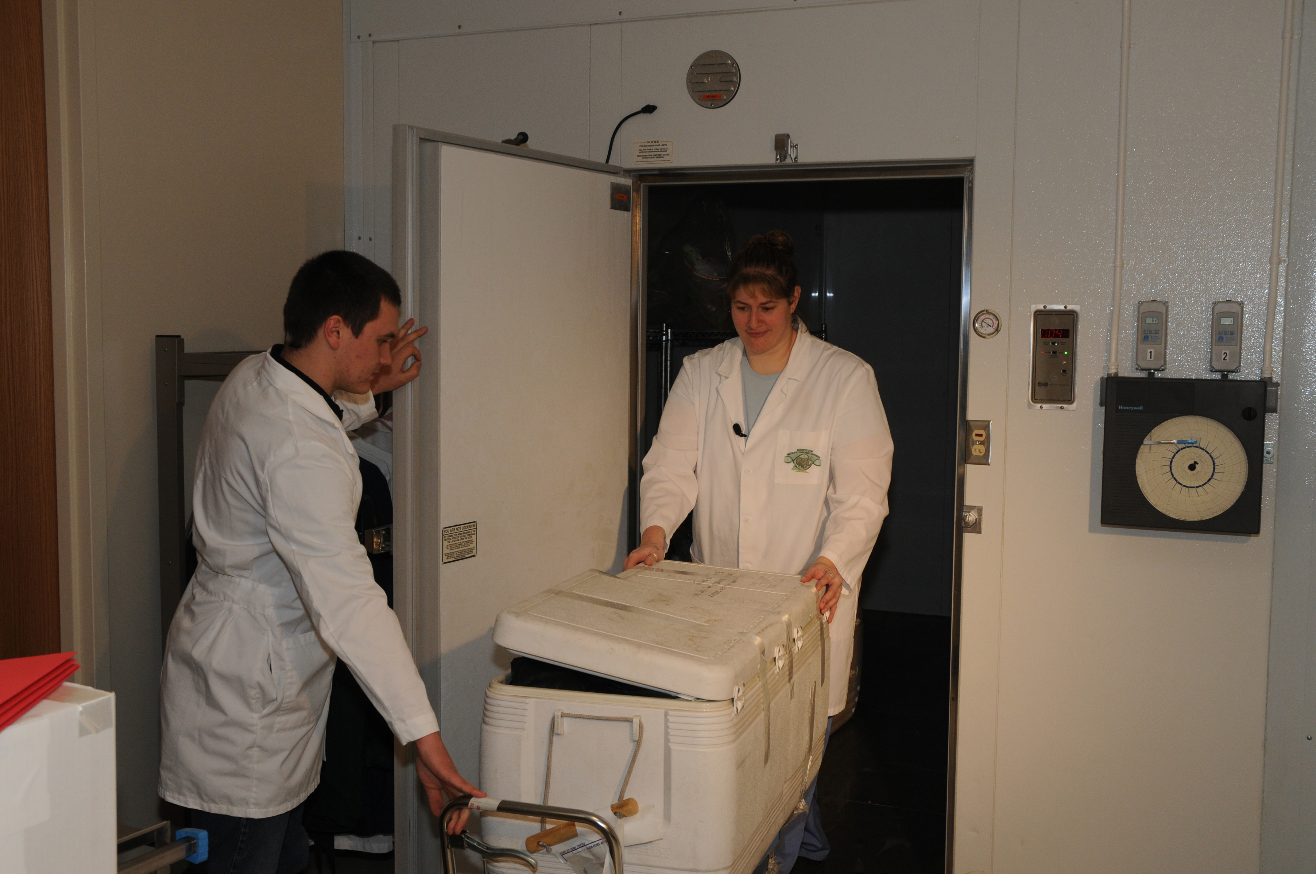 Laura Daugherty, Forensic Lab Technician, receiving a cooler with evidence.