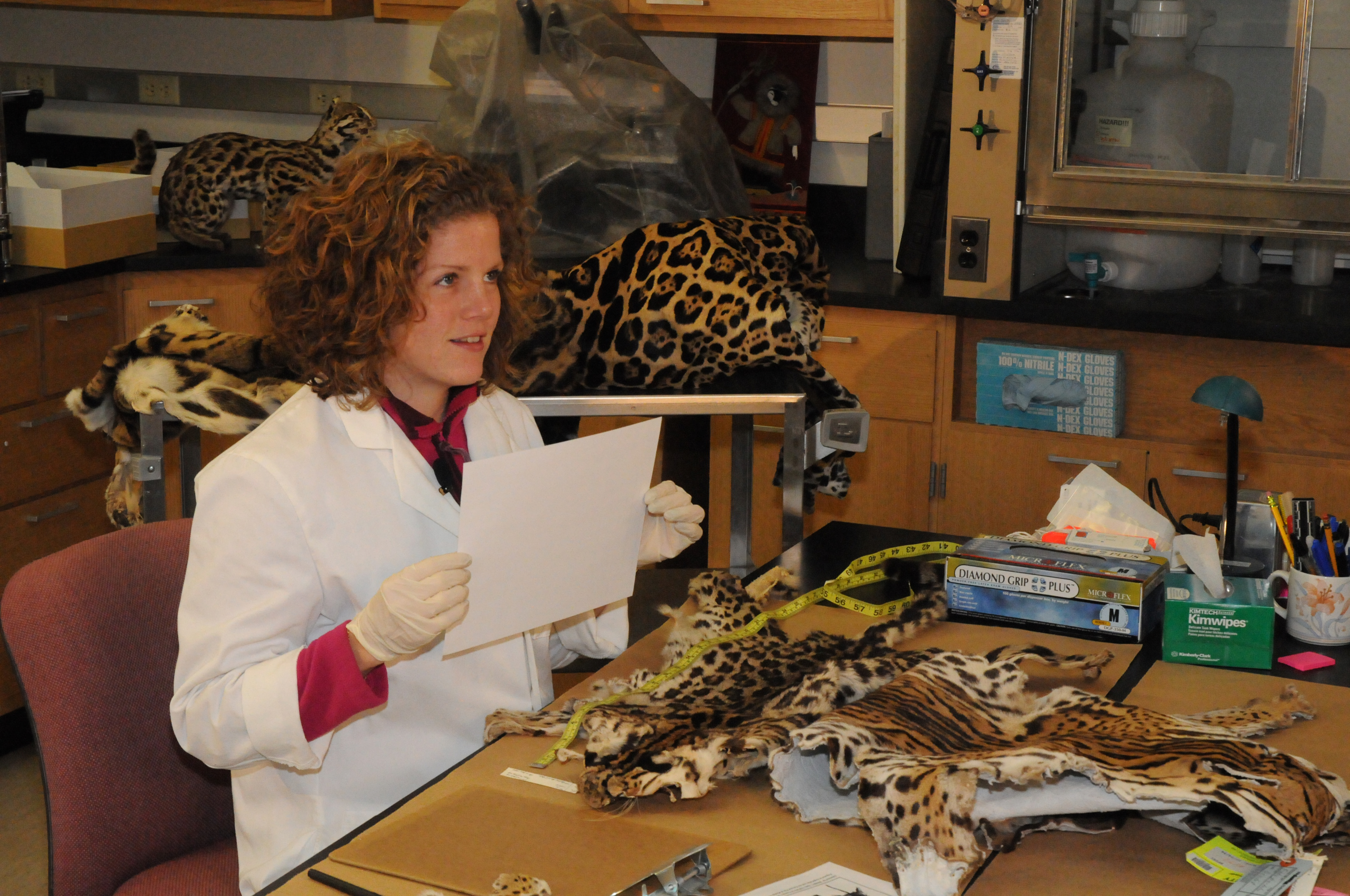 Cookie Sims, Mammal Morphology, inspecting wild cat skins.
