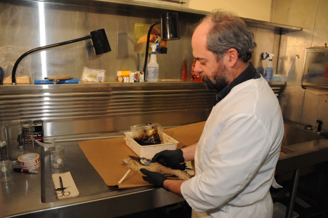 Pepper Trail, Senior Forensic Scientist, showing feathers of a Blue-winged Teal duck.