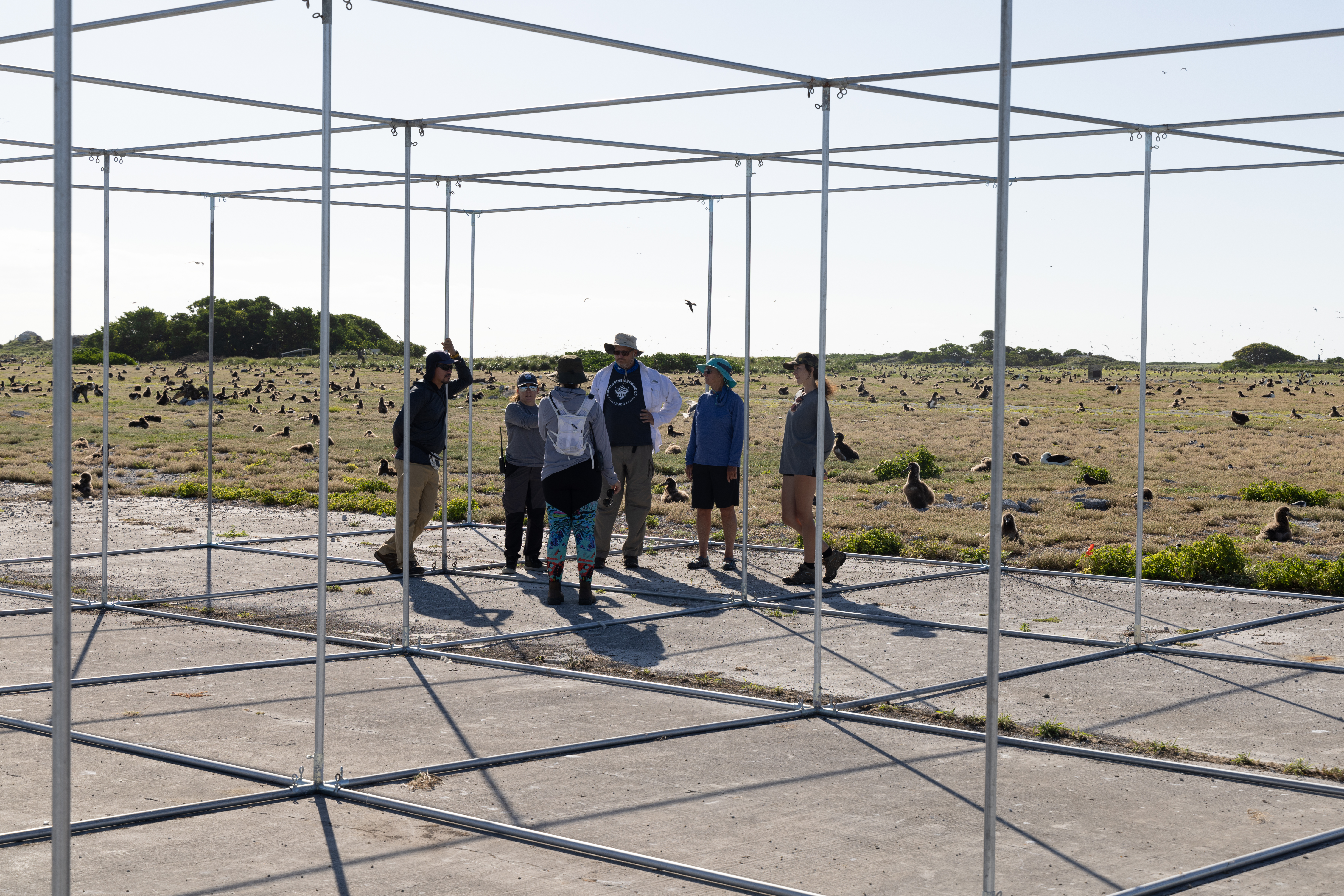 Members of the Seabird Protection Project team assembling Eastern Island aviaries on Midway Atoll National Wildlife Refuge.