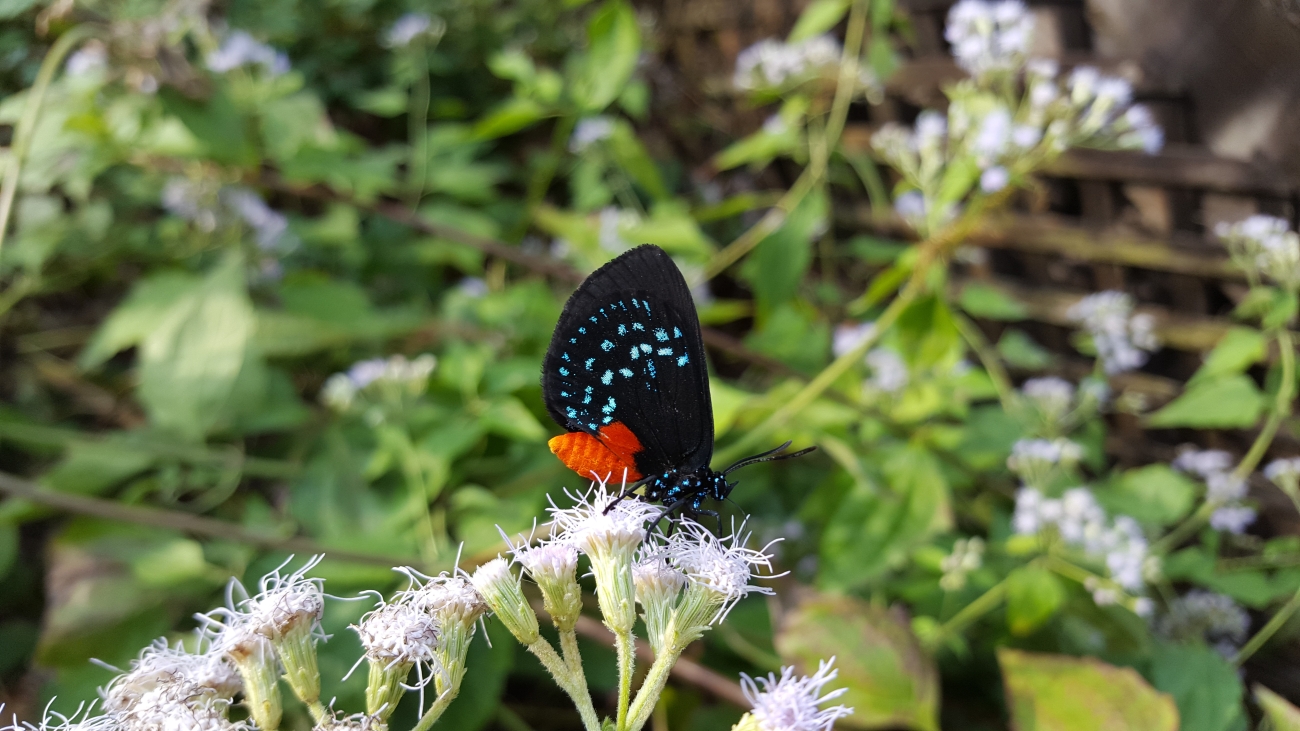 An atala butterfly stops for a drink of nectar on a blue mistflower.