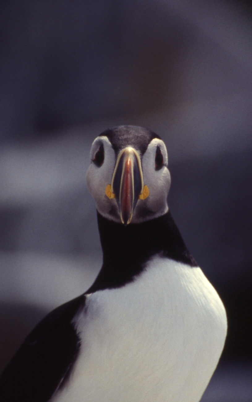 Close up view of Atlantic puffin looking straight on at camera. NOTE: Images donated by Petit Manan National Willdife Refuge, Maine. Image provided by USFWS National Digital Library.