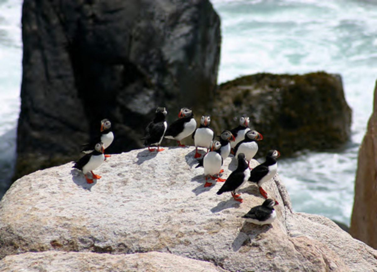 Atlantic puffins perched on Matinicus Rock, Maine Coastal Islands National Wildlife Refuge Complex.