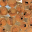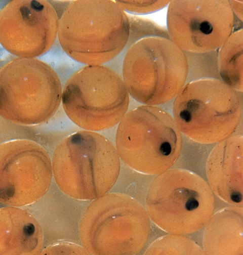Microscopic view of Atlantic salmon eggs near hatching. By March, and the onset of Spring, Atlantic salmon eggs are well developed. The head, eyes, heart, fins, vertebrae and blood vessels can be seen. Hatching produces a "sac fry" which remains in the gravel stream substrata.