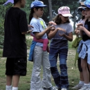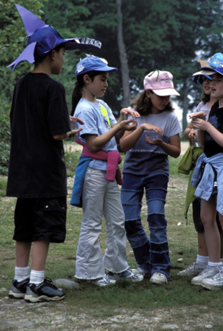 Children from Florence Rideout Elementary School in Wilton, New Hampshire take part in the Adopt a Salmon program and release Atlantic Salmon fry that were raised in their classroom. May, 2002