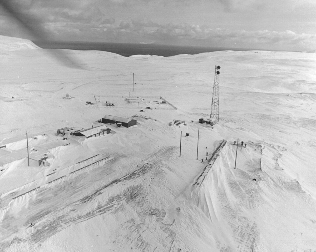 Aerial winter photo Atomic Energy Commission installation at the western end of Amchitka Island. Roads to the east end are cut off during winter snows. Strong winds cause much drifting. Alaska Maritime National Wildlife Refuge; Aleutians; ARLIS; Alaska. FWS-5927