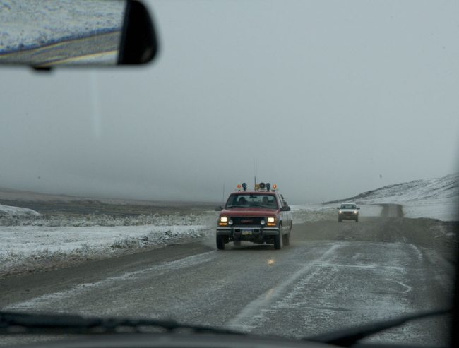 On-coming traffic on Dalton Highway during an August snowstorm. Human impacts; Tundra; Ecosystems; Snow; Automobiles; Roads;