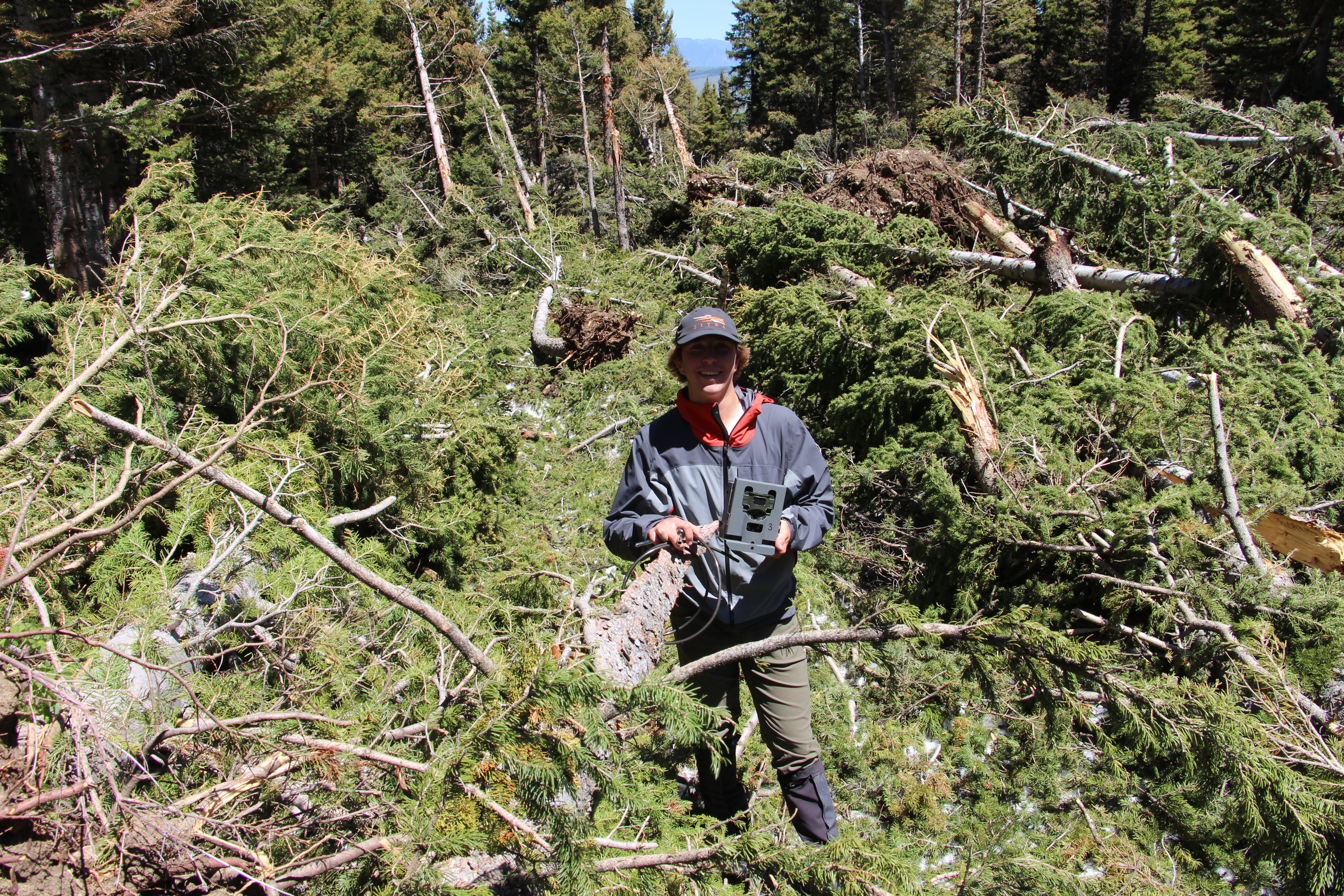 While checking remote camera traps in the mountains for a Refuge carnivore inventory, USFWS Volunteer Sam Waller found a displaced camera trap that was buried in mangled and downed timber caused from a massive winter avalanche. The camera was carried 86 yards away from its original placement and amazingly undamaged. Thanks for finding that camera for us, Sam! Photo by Cortez Rohr/USFWS