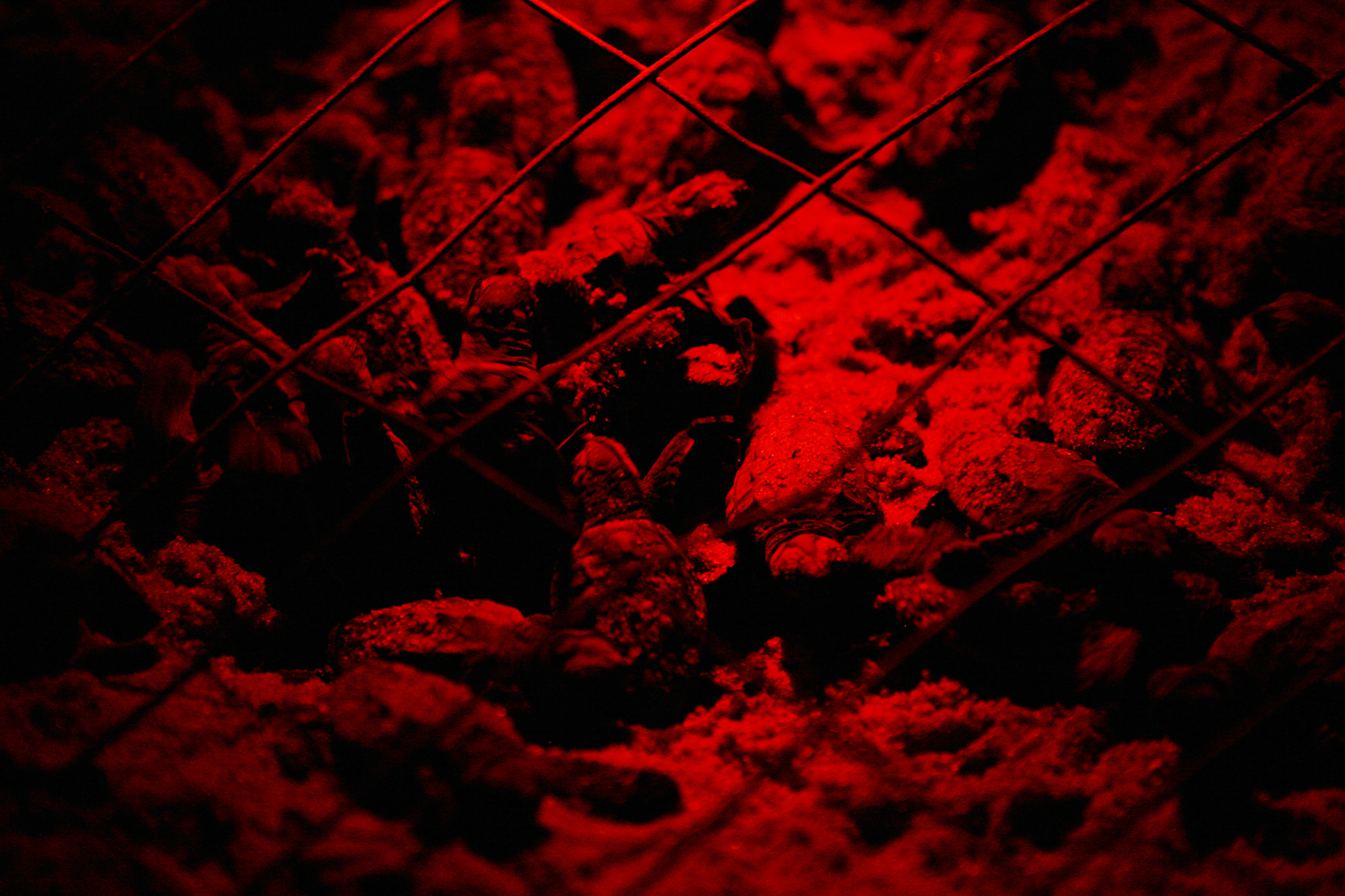 Fish and Wildlife Service staff and volunteers help guide disoriented baby loggerhead turtles towards the ocean with the help of a red light which does not interfere with their sense of direction.