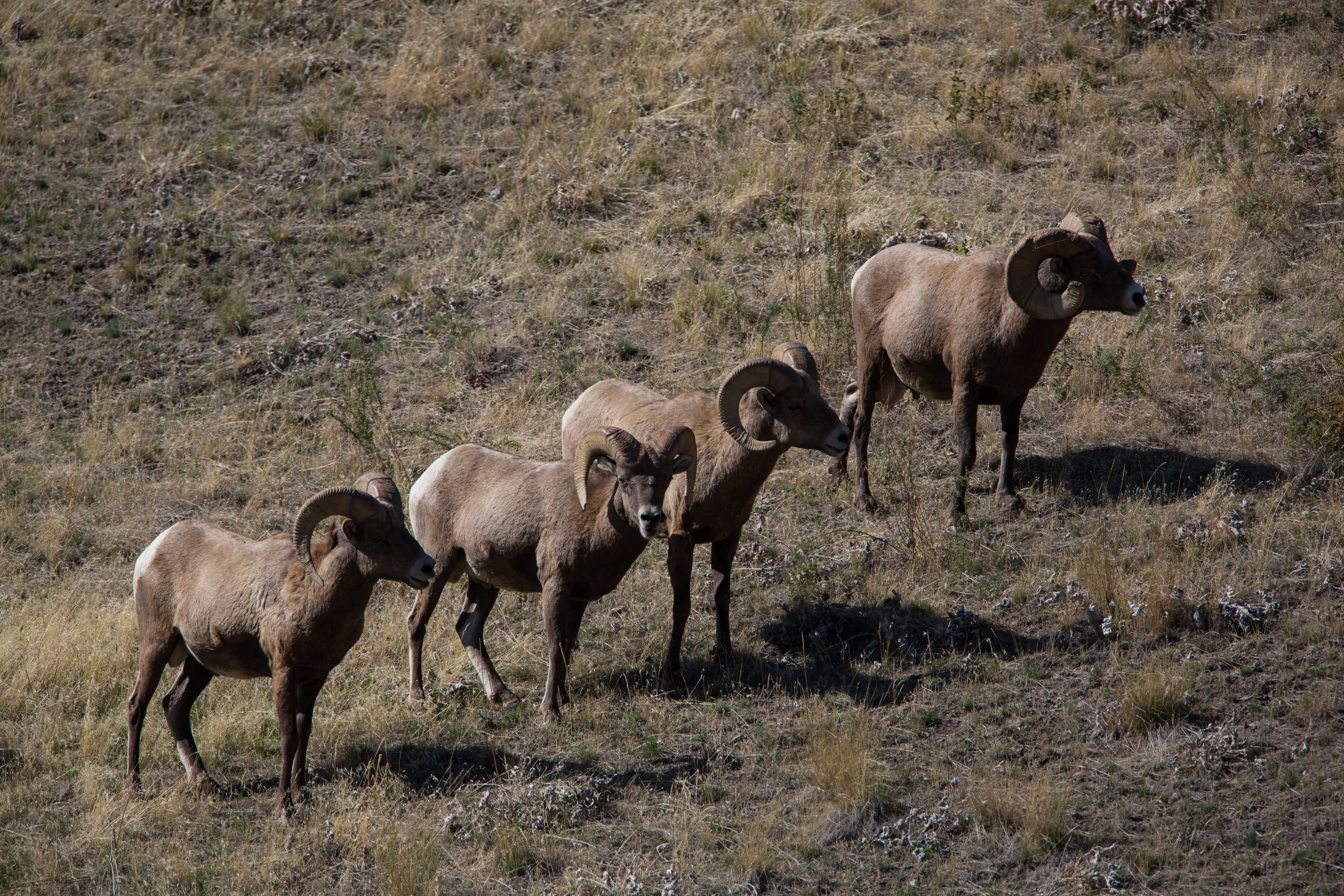 Bachelor group of rams walk a hillside