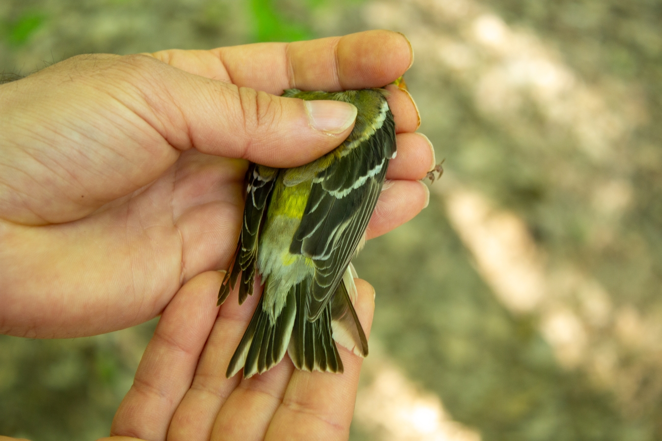 An American Goldfinch that was captured in a mist net is examined to determine age and sex by looking at its tail feathers and coloration.