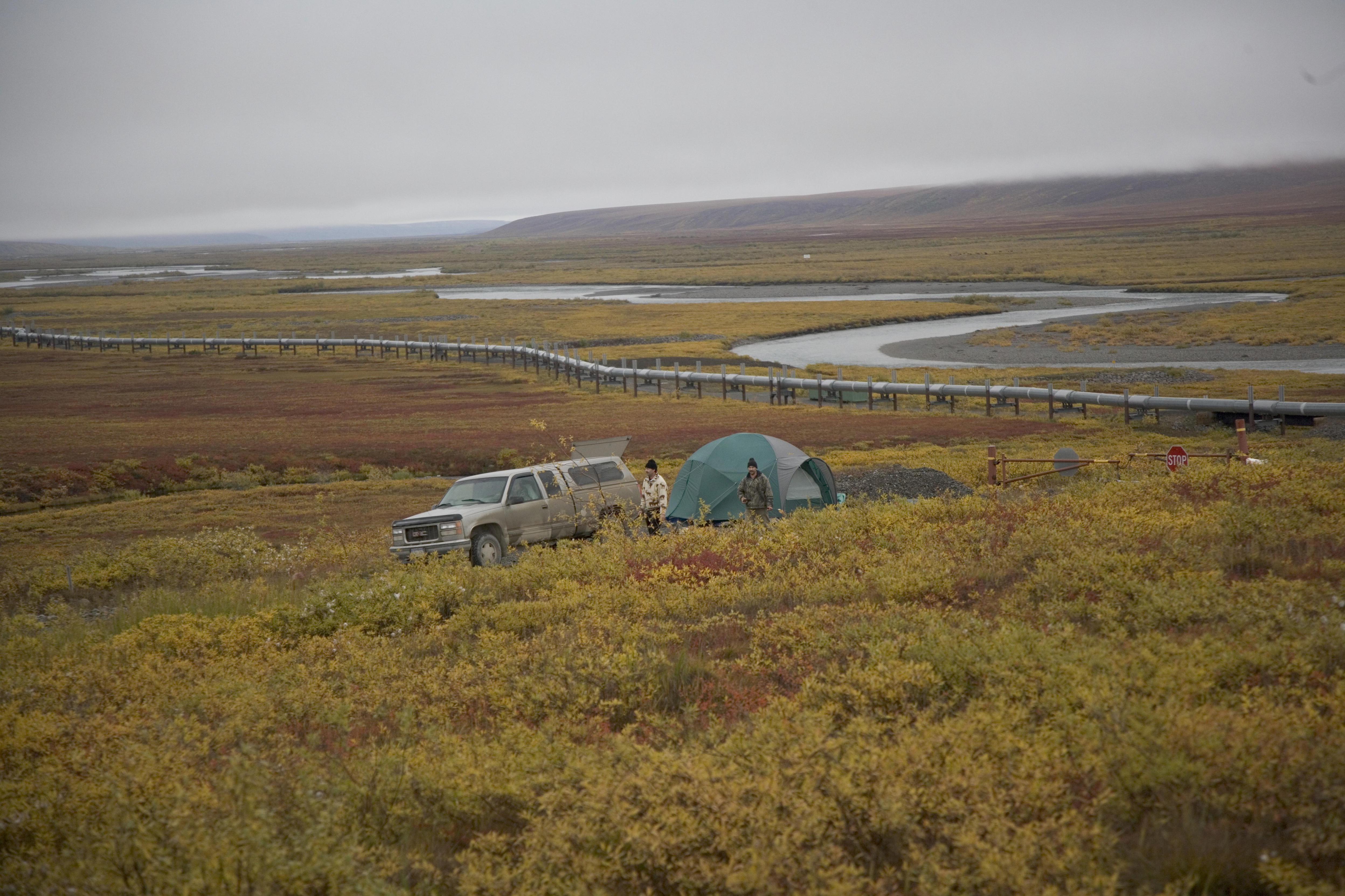 This picture shows a tent in a rural area by a pipeline.