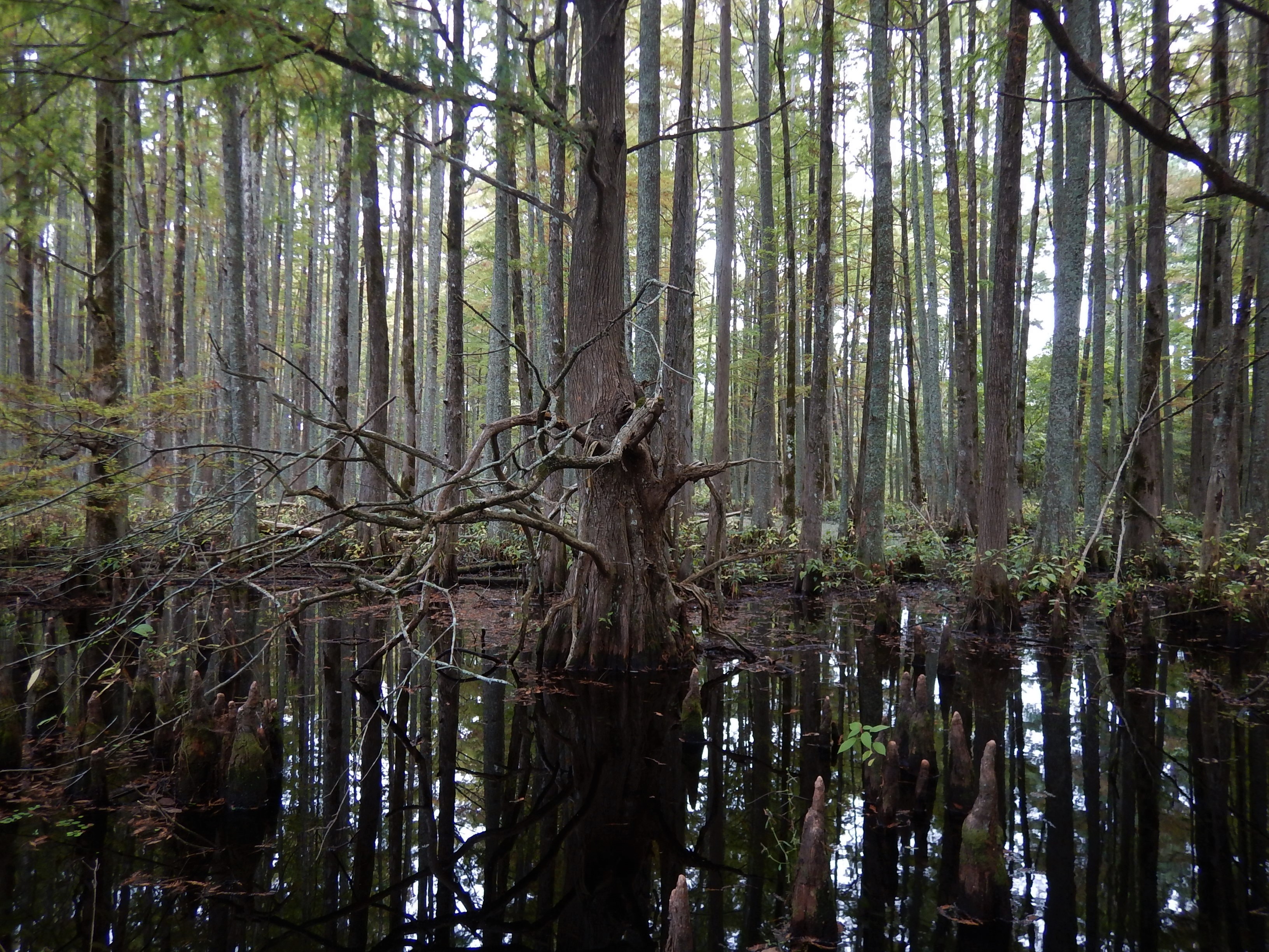 A bald cypress swamp along the New Holland Trail at Mattamuskeet National Wildlife Refuge in North Carolina
