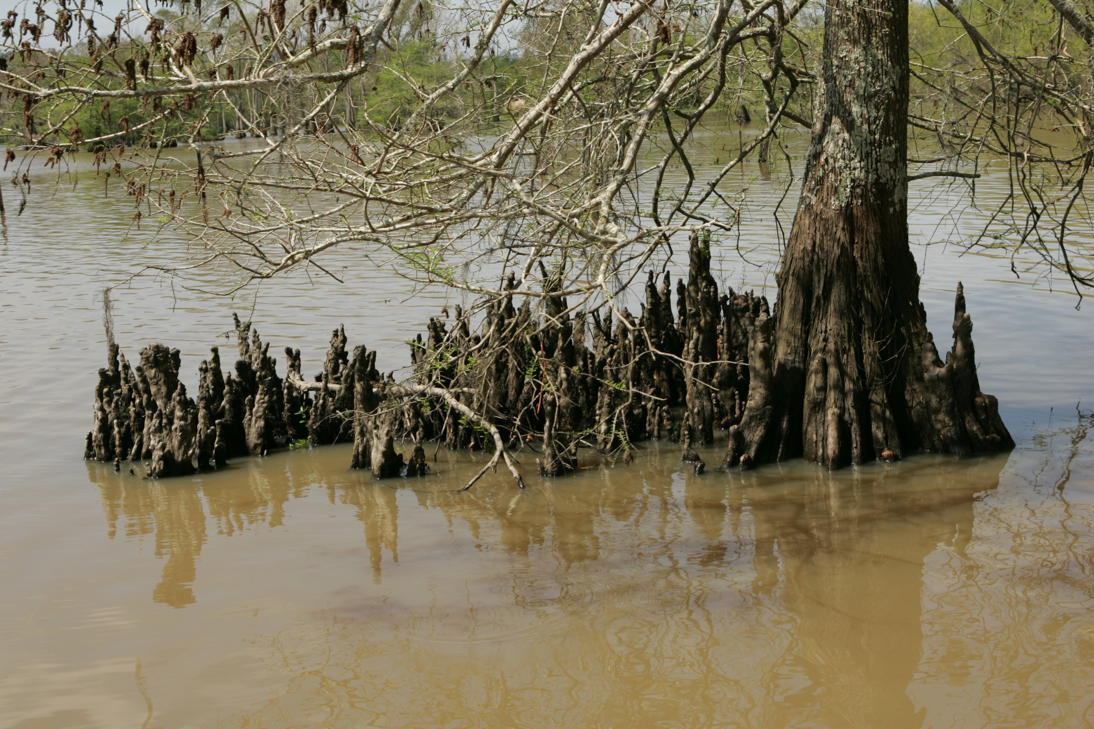Bald cypress trunk and knees sticking above muddy water; some branches show few needles.