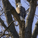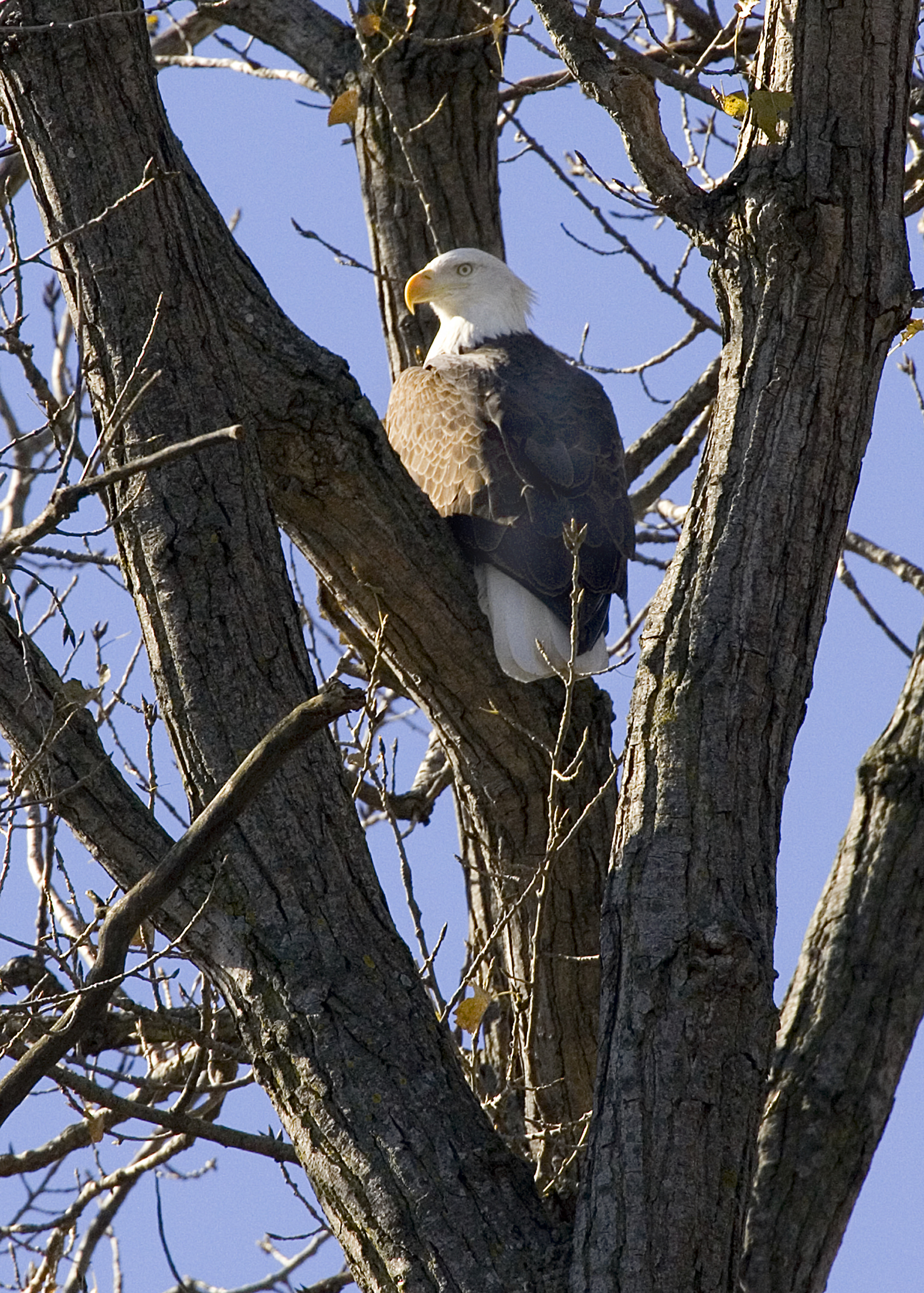 Bald eagle viewed from the rear and looking over its shoulder while it sits surrounded by limbs in a tree.