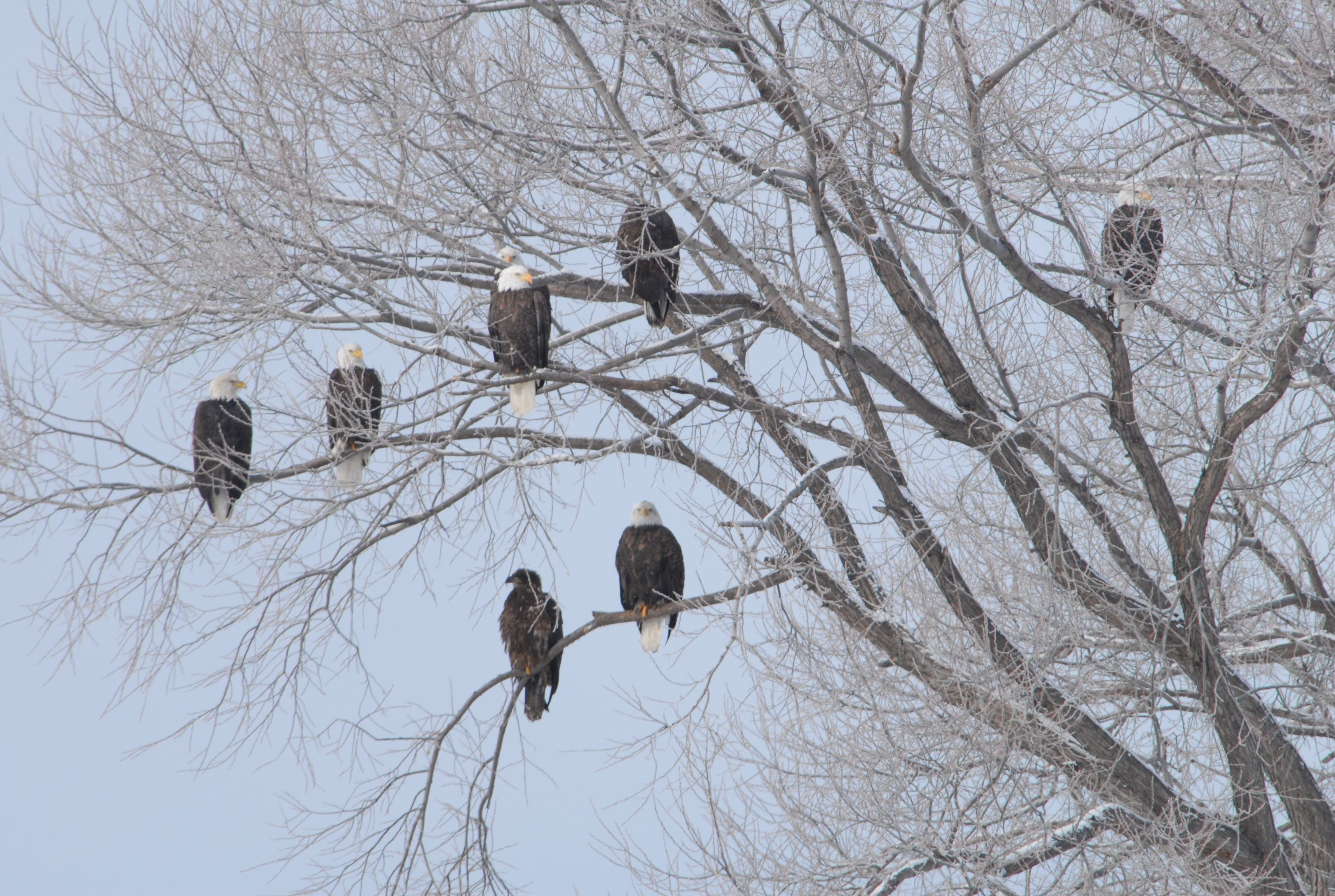 Eight bald eagles perch in one tree at Lower Klamath National Wildlife Refuge in California. Yes, eight. One is mostly obscured.