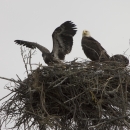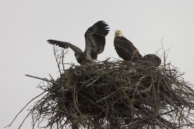 In the summer of 2006, a pair of bald eagles nested on the south side of Beluga Slough near the Islands and Ocean Visitor Center in Homer, Alaska. Thousands of visitors were able to watch the nest building and rearing of the young until fledging occurre