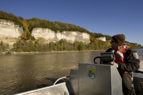 Fish and Wildlife Service employee observes the banks of the Missouri River via boat.