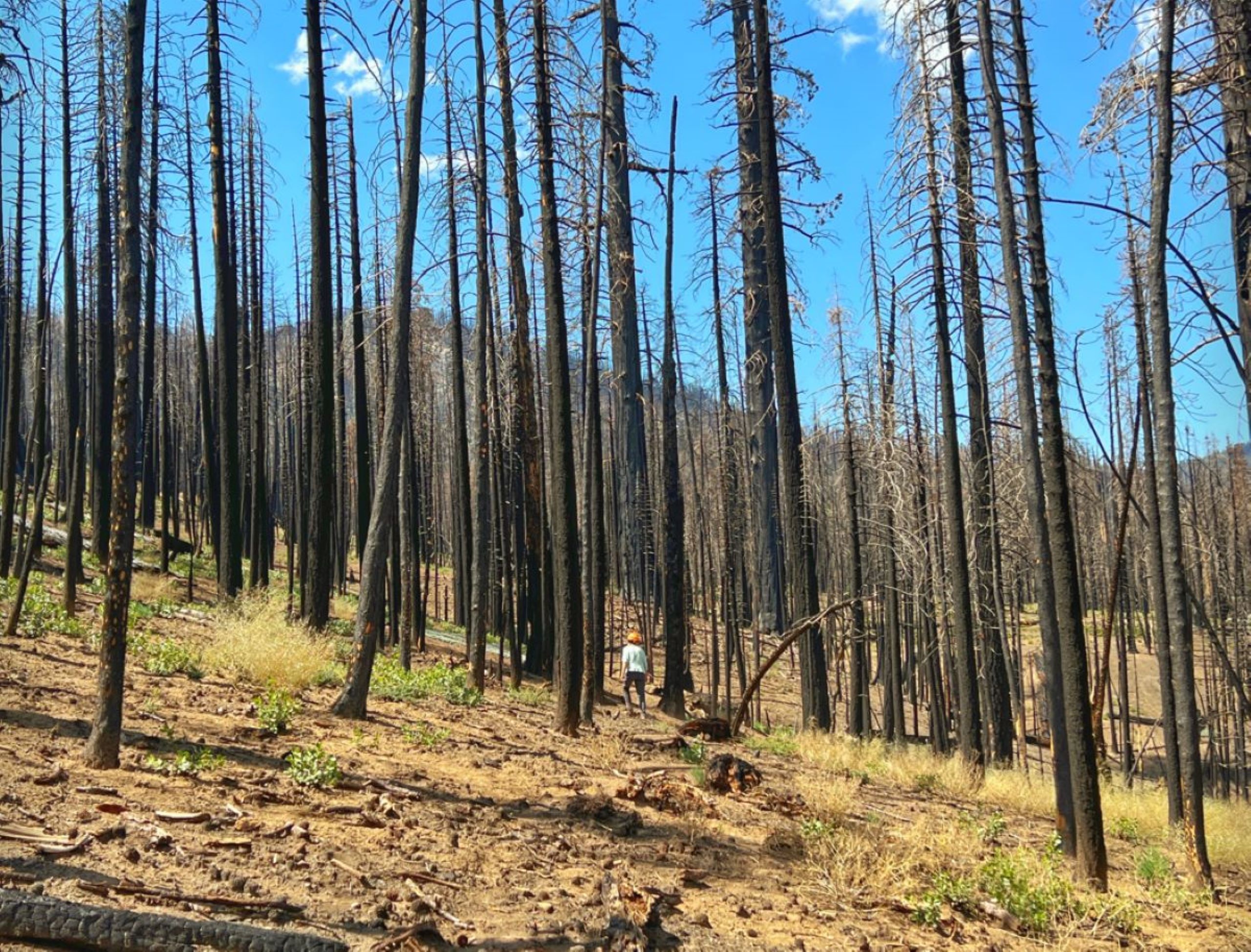 A USFS biologist looks at trees scorched by the Castle Fire. Two years after the fire, little vegetation has returned to the landscape.