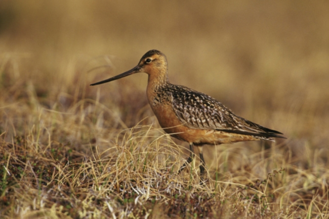 Bar-tailed Godwits are large wading birds at about 37 to 45 cm. The Bar-tailed Godwit is a mottled brown in the upper body and a lighter buff below. It has a white underwing, and a long, slightly upturned bill. As the name suggests, the white tail is barred with brown. This is the non-breeding plumage of the Bar-tailed Godwit and is the main phase seen in Australia. The breeding plumage is darker and more rufous, with females duller than males. Young birds resemble non-breeding birds. For more information about this species visit http://www.mbr-pwrc.usgs.gov/Infocenter/i2500id.html For more information about migratory shorebirds visit http://www.fws.gov/birds/