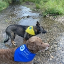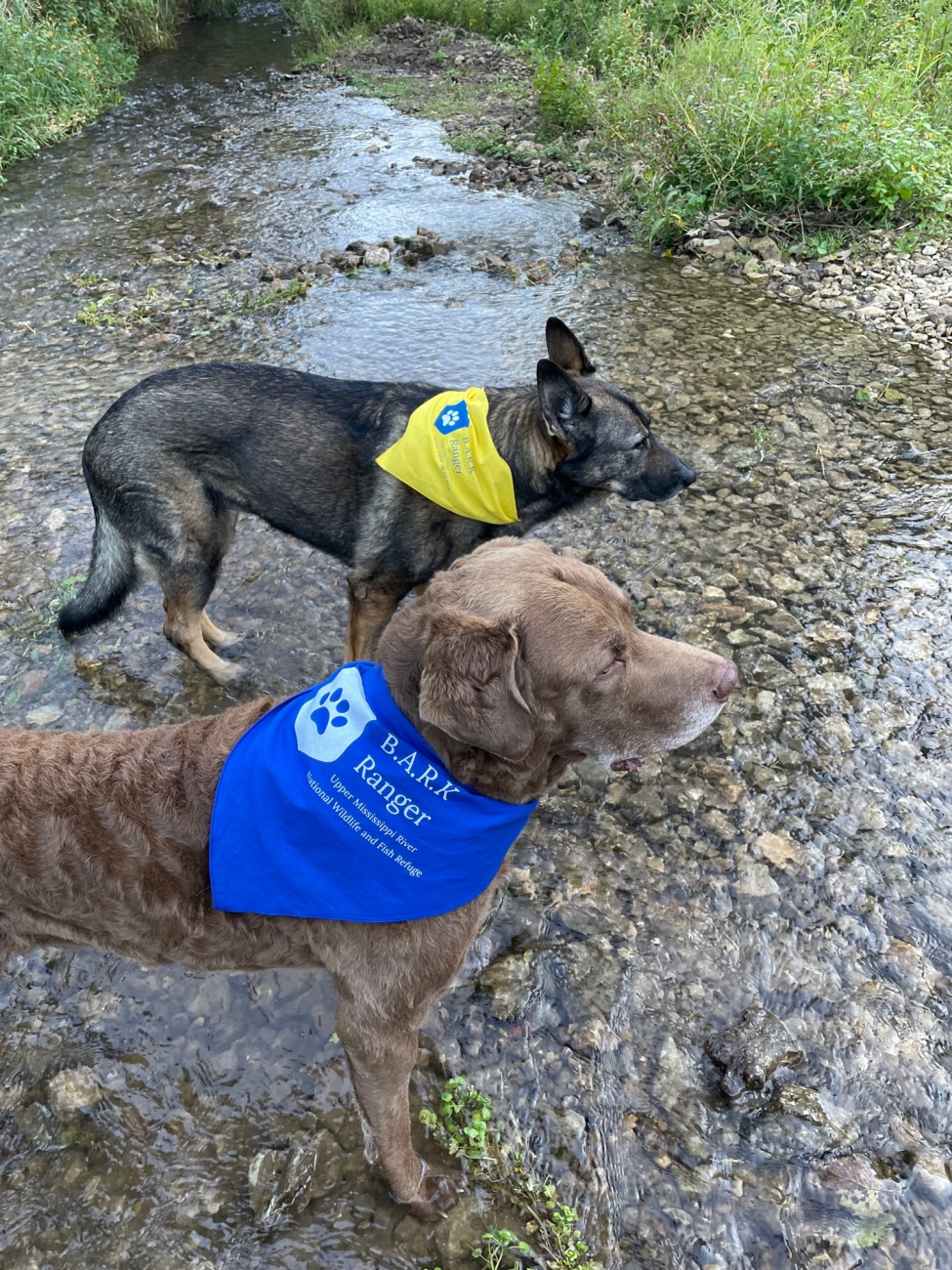 Two large dogs stand in a shallow creek wearing a yellow and a blue BARK Ranger bandana