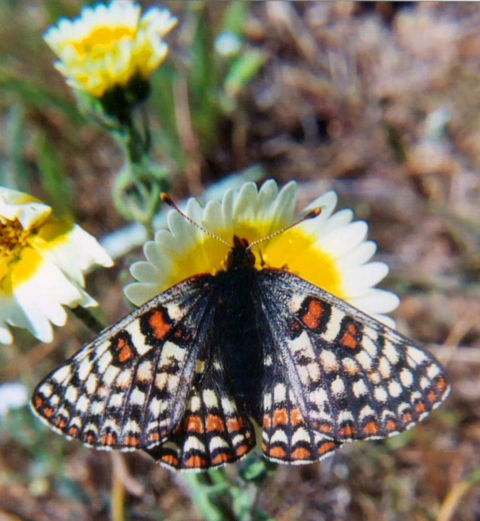 Dorsal view of the endangered Bay Checkerspot butterfly