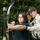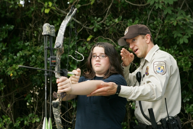 Alligator River National Wildlife Rerfuge employee, steadies the arm of a young archer preparing to shoot.