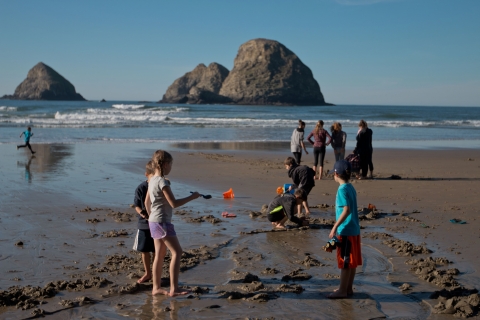 Adults and children on the beach at Three Arch Rocks as seen from Oceanside, OR.