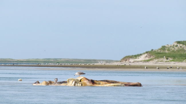 A 1-week old beached whale with seagulls in shallow water along the coast of South Monomoy Island at Monomoy NWR.