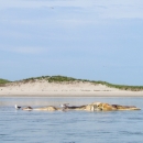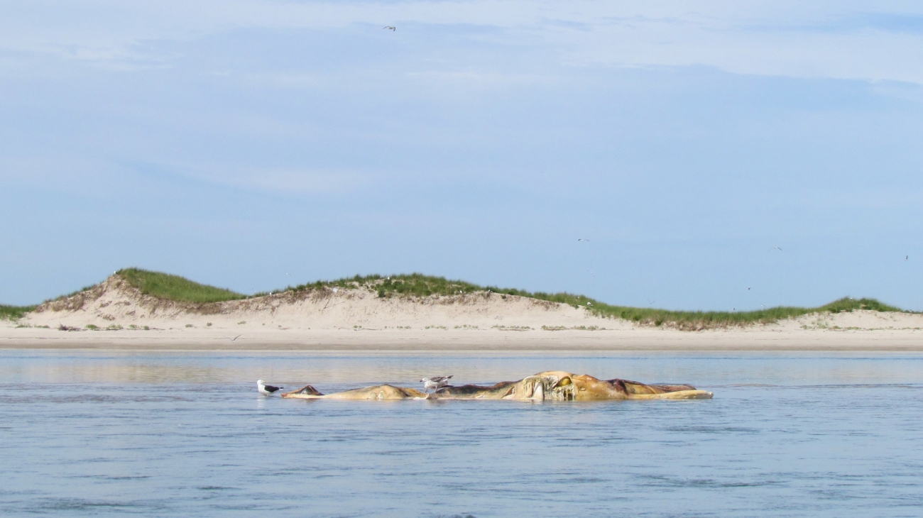 A 1-week old beached whale with seagulls in shallow water along the coast of South Monomoy Island at Monomoy NWR.
