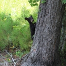 Bear cub starting to climb a tree and looking into the camera as if getting caught.
