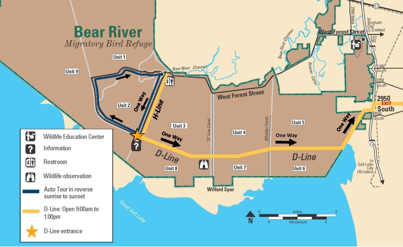 Map of Bear River Migratory Bird Refuge showing boundaries, Auto Tour, and D-Line.