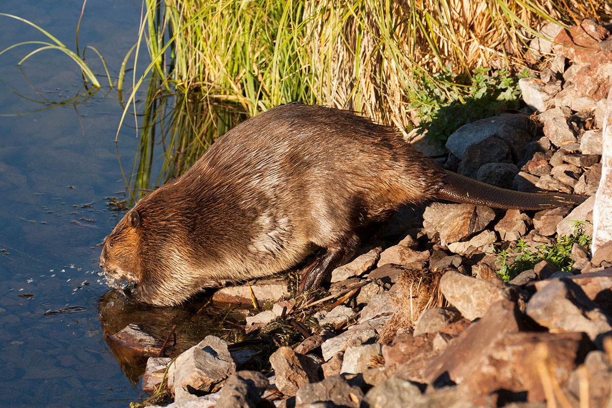 A beaver heads into the water at Red Rock Lakes National Wildlife Refuge in Montana. Beavers are abundant at the refuge and provide important ecosystem services such as creating wetlands.