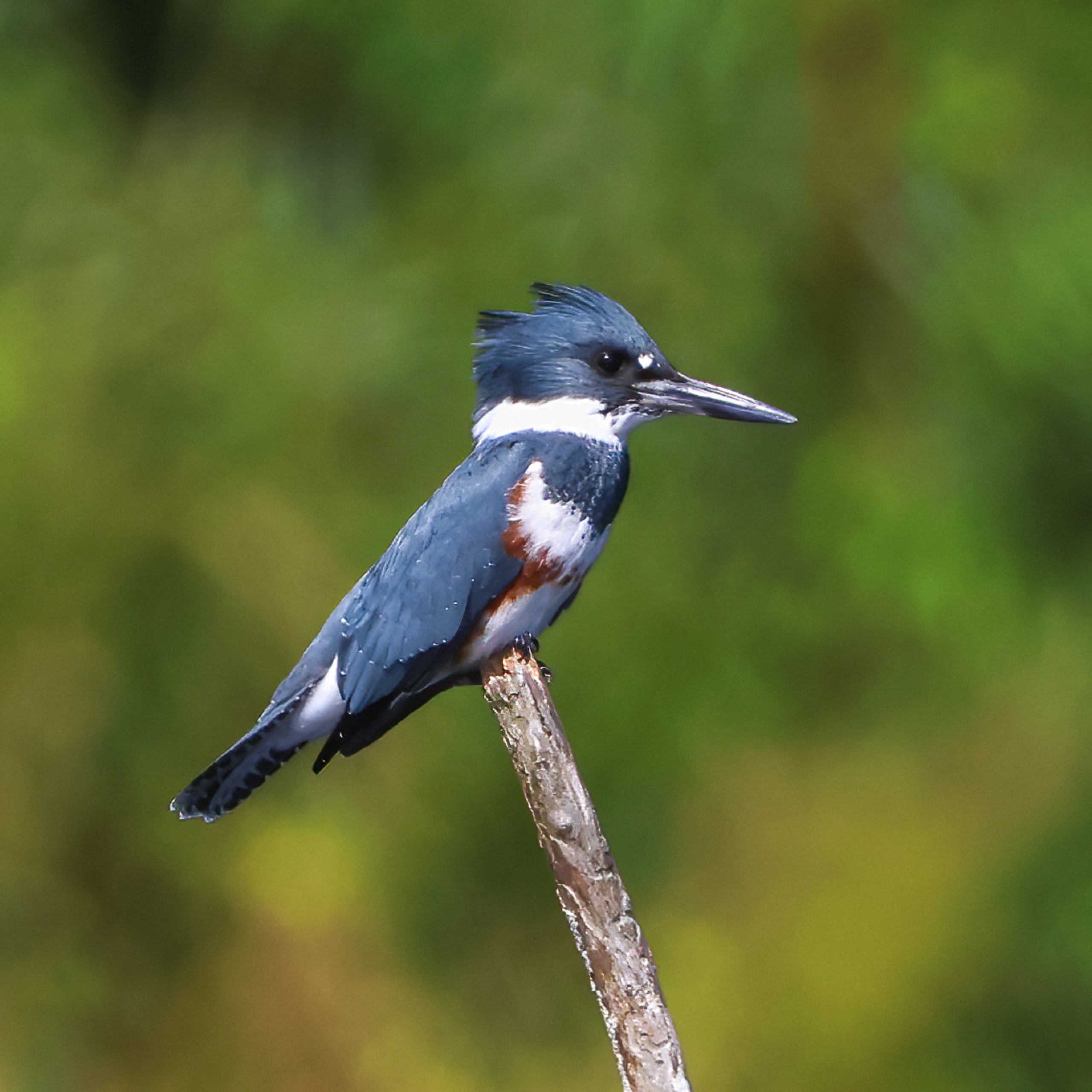 Blue-gray, white with a brown body stripe, female belted kingfisher sitting on the end of a branch