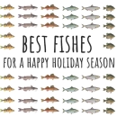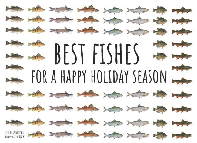 Duane Raver illustrations, from left to right: Largemouth bass, Yellow perch, Channel catfish, Walleye, American shad, Blueback herring, Bluegill, and Brook trout.