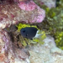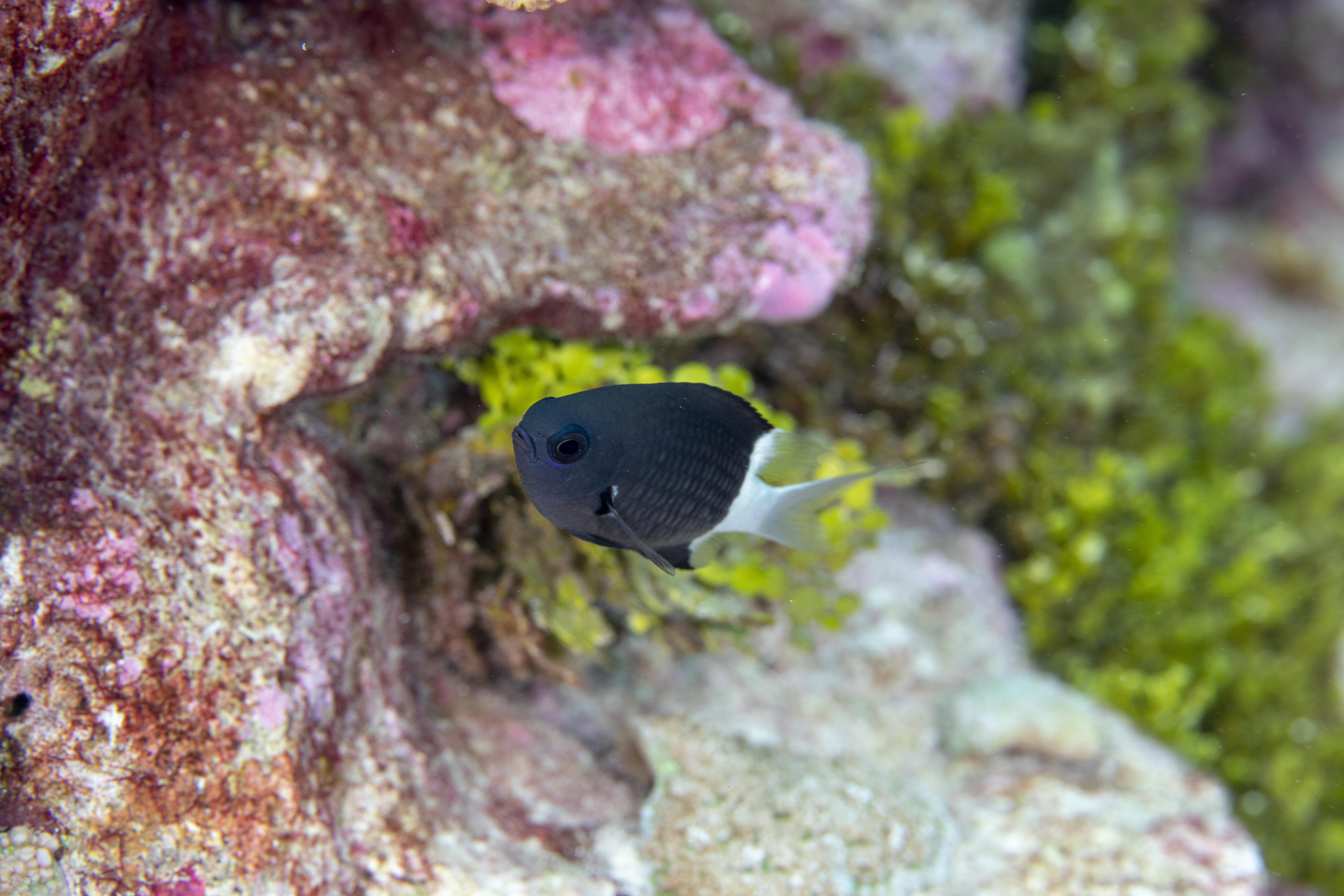 Bicolor chromis is a species of marine fish. Bicolor chromis seen swimming around the coral at Palmyra