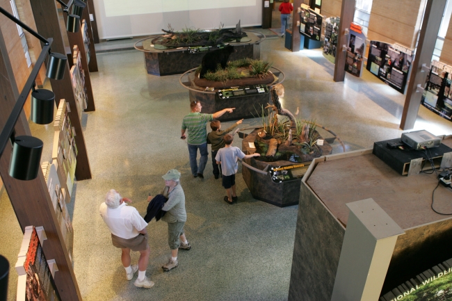 People enjoying the exhibits inside the visitor center.