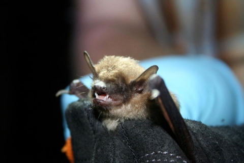 Biologist holds a Big brown bat. FWS biologists examine for White-nose syndrome.