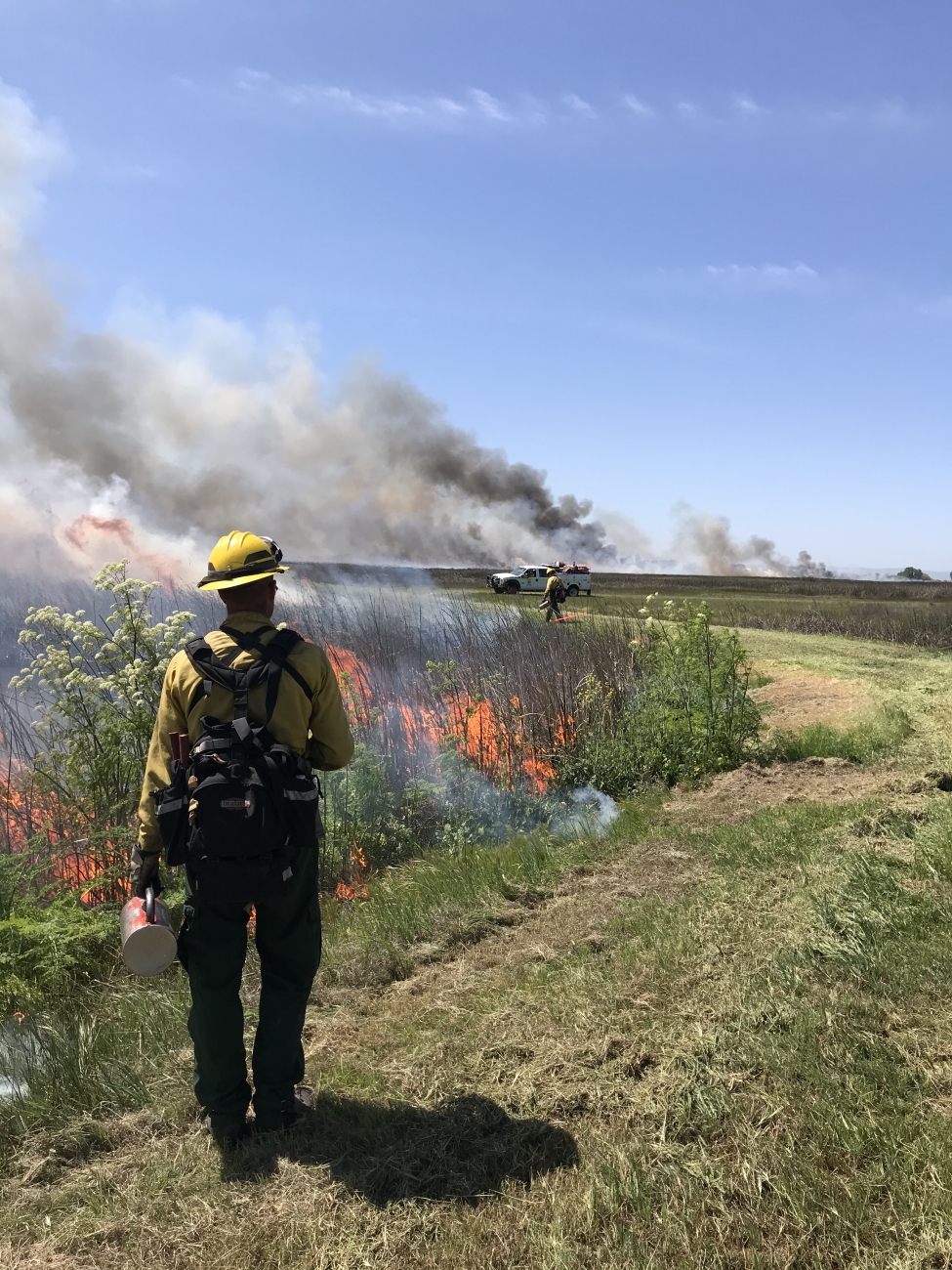 Kyle Whiteaker lights a prescribed burn at San Luis National Wildlife Refuge. Credit: Sara Araiza/USFWS