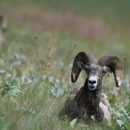 Close view of male bighorn sheep laying in wildflowers. For more information about the National Bison Range visit http://www.fws.gov/bisonrange/