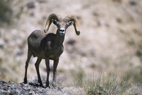 Close view of male bighorn sheep standing in dried vegetation and rocks.