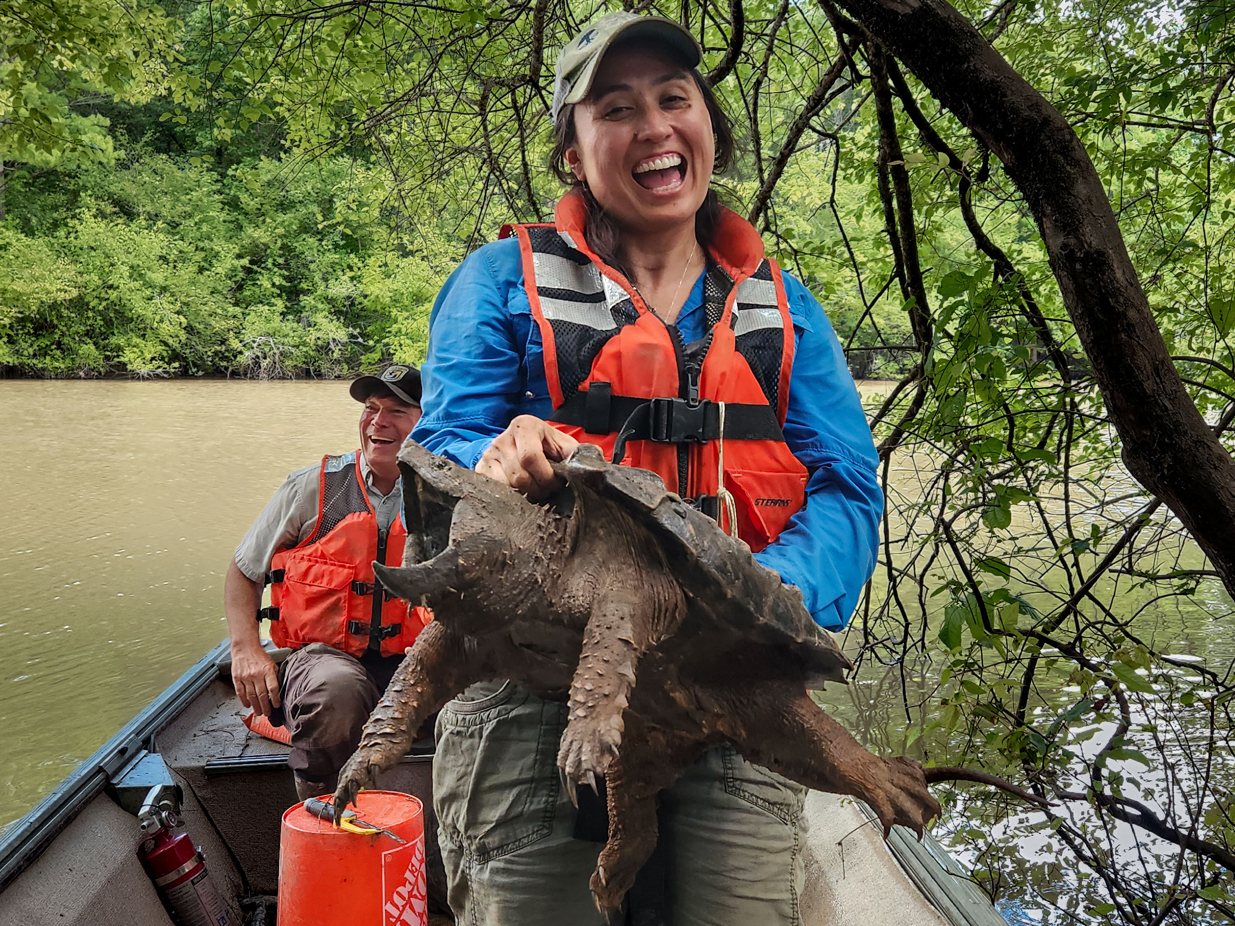 U.S. Army Corps of Engineers Biologist Kristina Mitchell poses with a 26 pound female alligator snapping turtle while Refuge Manager Patrick Fitzmorris drives the boat in Dale Bumpers National Wildlife Refuge May 15, 2024.