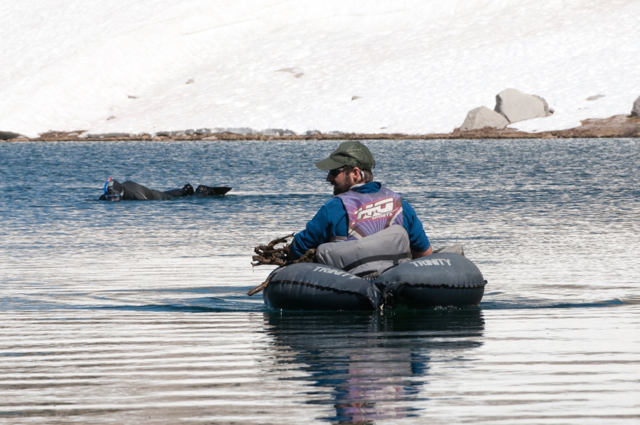 Biologist and photographer in lake. Center Basin, Kings Canyon National Park