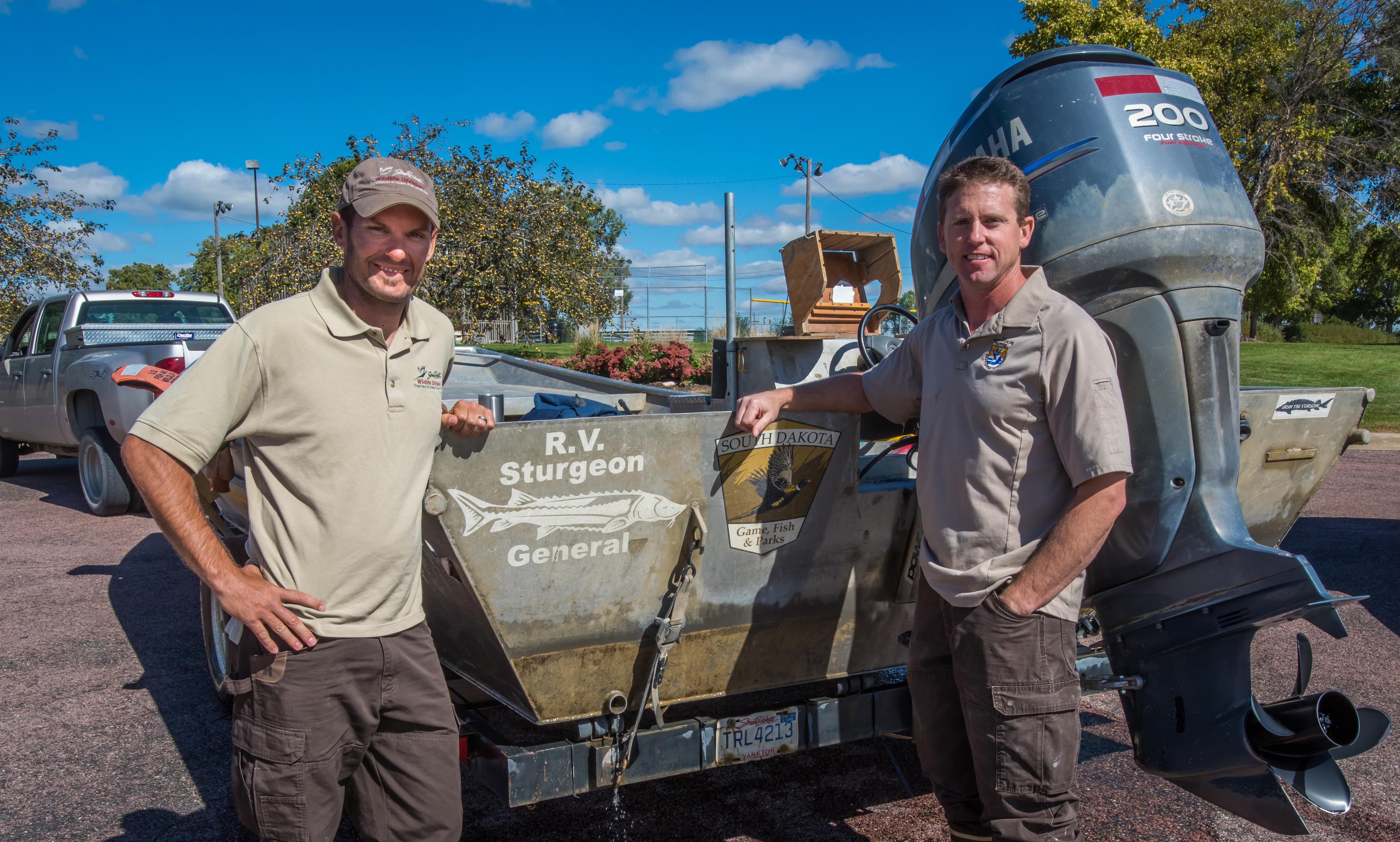 Biologist at boat near Missouri River near Yankton, South Dakota