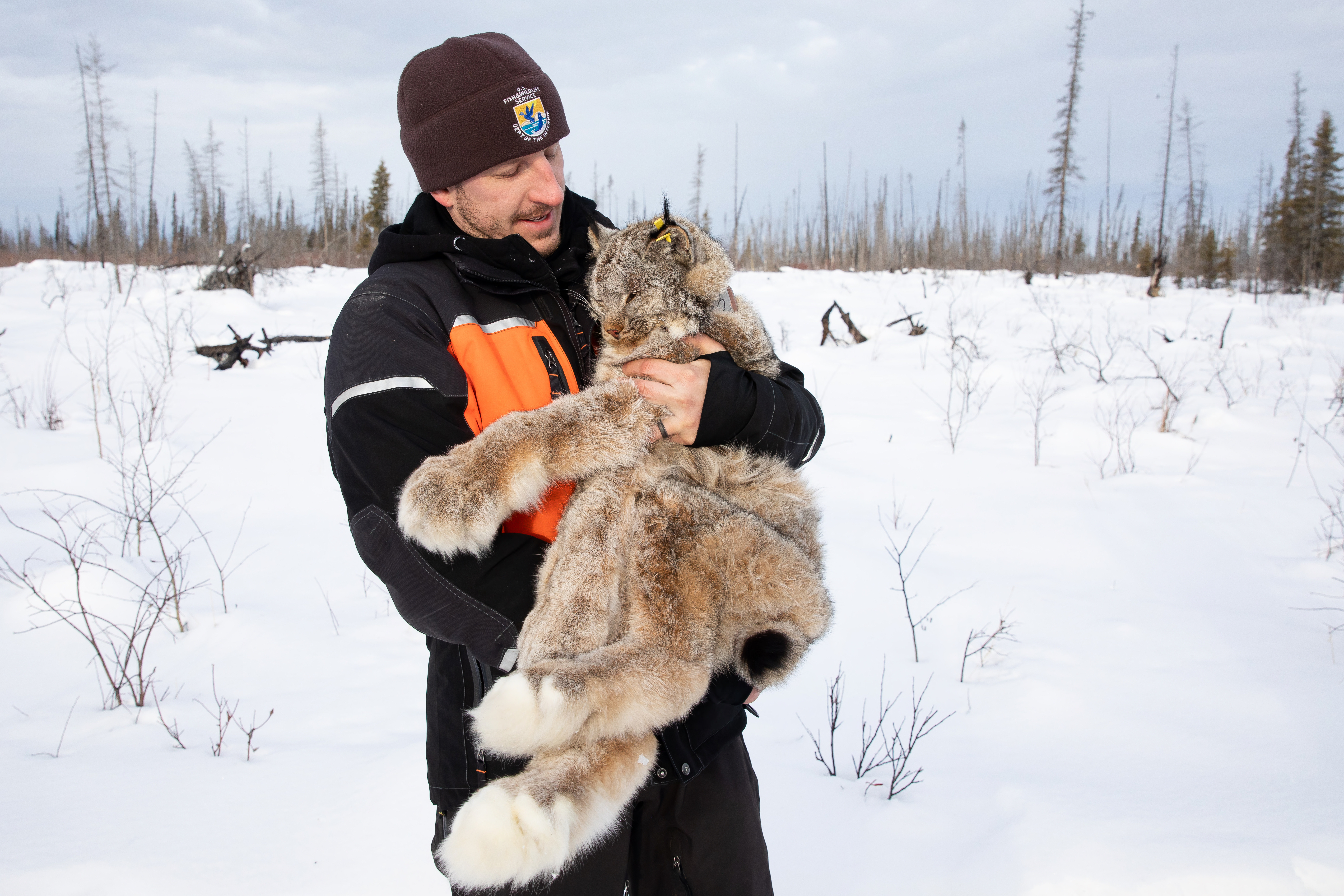 After the sedated lynx has been measured and collared, biologists carefully move it to a recovery position near deep snow and cover. Lynx Project At Yukon Flats National Wildlife Refuge.